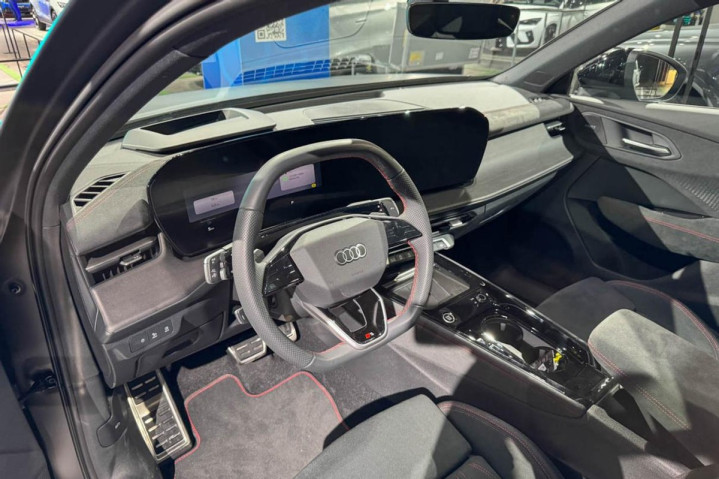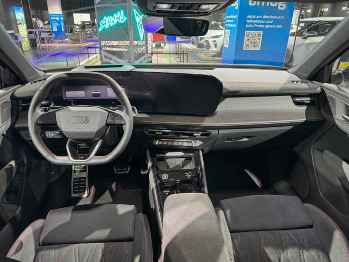 进入到座舱里,奥迪Q3 Sportback的三辐式方向盘带有部分触控,平底结构带有D型设计,而包括门板、座椅等在内的红色绗缝都是属于S运动套件的一部分。方向盘前端有可选的HUD抬头显示,而中央则是11.9+12.8英寸双联曲面屏,其中的触控屏尺寸要比新一代奥迪A6、奥迪Q5小一些。但副驾驶一侧并没有布局独立的娱乐屏,这还是比较可惜的。